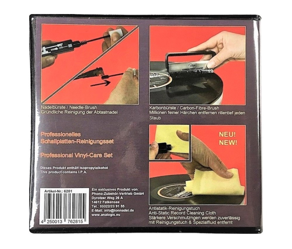 Balení obsahuje jemnou antistatickou uěrku, vysoce kvalitní kartáček s tisíci karbonovými vlákny, čistící roztok na hrot přenosky s aplikátorem a čistící emulzi na vinylové desky. To vše je zabaleno v jediném praktickém a snadno přenosném balení.